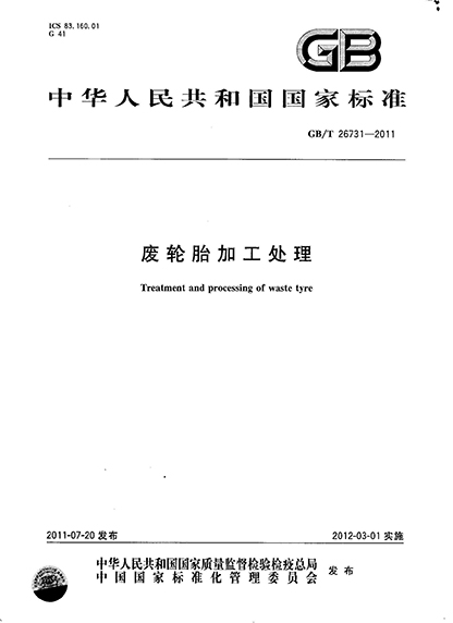 2012月3月,公司為主要起草單位的國家標(biāo)準(zhǔn)《廢輪胎加工處理》標(biāo)準(zhǔn)號(hào):GB/T26731-2011,正式頒布實(shí)施