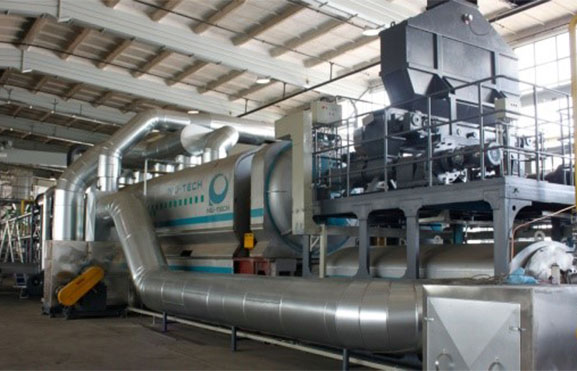 熱解過程完全不結(jié)焦,獨有的熱分散技術(shù)保證物料受熱均勻、導熱效率高,可在較低的溫度下完成物料氣液固分離;不凝可燃氣經(jīng)凈化后作為燃料用于供熱,采用煙氣余熱循環(huán)技術(shù),節(jié)能減排;物料冷卻采用循環(huán)水間接冷卻;工藝流程簡潔;處理成本遠低于國內(nèi)外其他廢棄物處理工藝及方式;